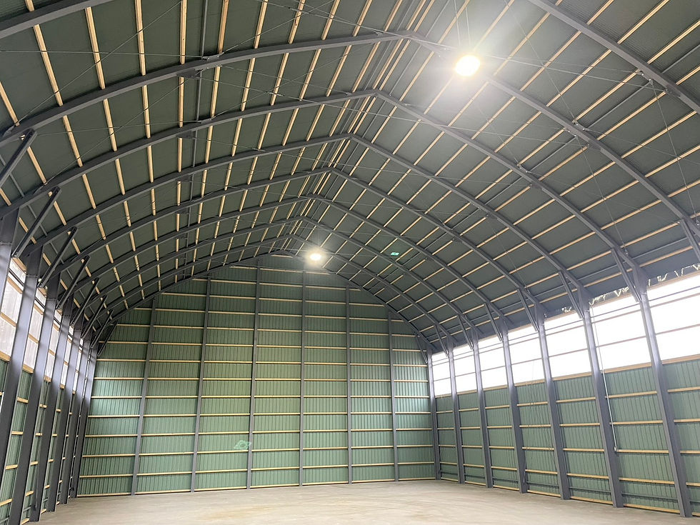 7k×14k DE型格納庫新築工事 屋根のアーチパイプは角パイプを加工してます。柱の高さはお客様との打ち合わせで5mにして、開口の高さも5mです。入り口側は屋根のみで突然の雨の時や仕事終わり明日の朝まで屋根下になど、使いやすさがあります。